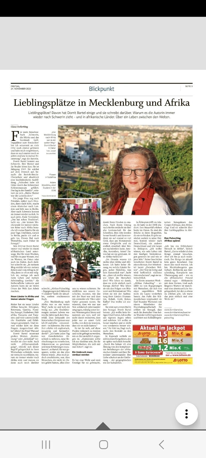 Ich komme erst jetzt dazu, diesen Text einzustellen, im vergangenen Jahr hatte ich mal die Seite 3 der Schweriner Volkszeitung. Mit Claus Oellerking sprach ich damals über meine Reisen nach Afrika und das damals frisch erschienene Buch "Afrikas Pulsschlag" , das inzwischen seine neue Heimat im Verlag LeseGlück gefunden hat.
