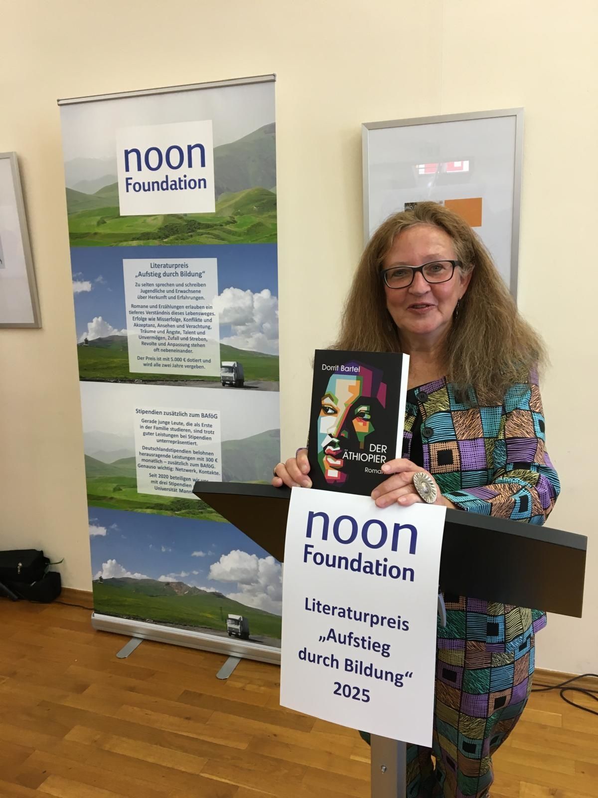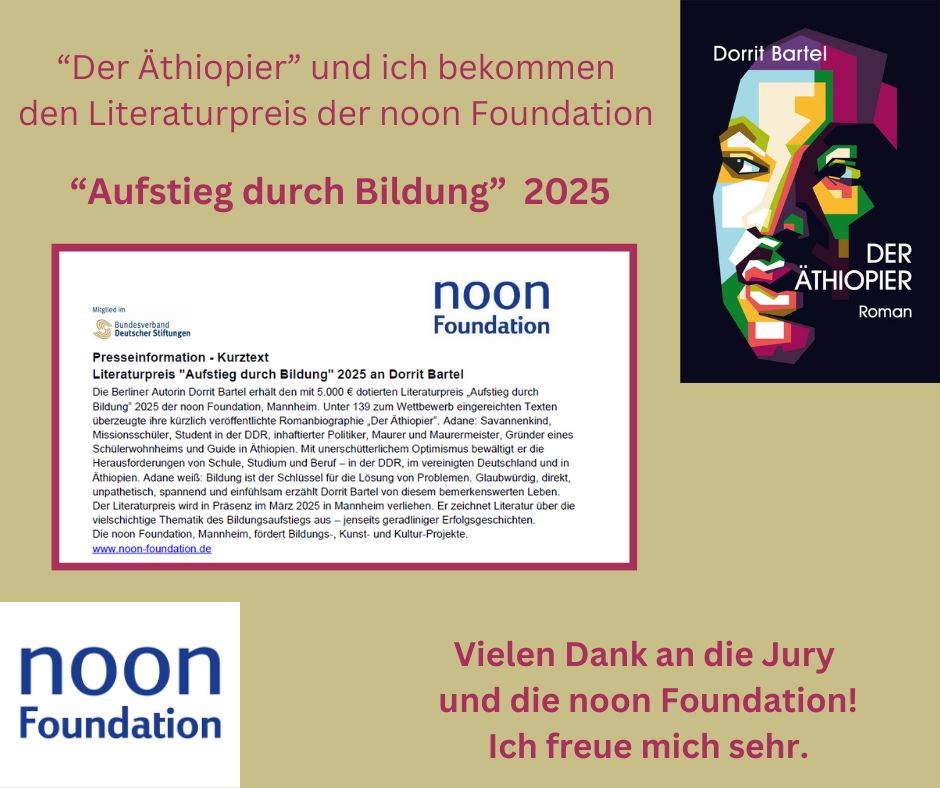 Wow, ich bekomme den Literaturpreis der noon Foundation "Aufstieg durch Bildung" 2025. Und da ich selbst noch ganz sprachlos bin vor Freude darüber, poste ich hier den Pressetext der Stiftung, der auch hier nachzulesen ist: https://www.stiftungen.org/aktuelles/news-aus-stiftungen/detail/literaturpreis-aufstieg-durch-bildung-2025-an-dorrit-bartel-14274.html Und bin dann erst mal weg. Feiern. Presseinformation - Kurztext Literaturpreis "Aufstieg durch Bildung" 2025 an Dorrit Bartel Die Berliner Autorin Dorrit Bartel erhält den mit 5.000 € dotierten Literaturpreis „Aufstieg durch Bildung“ 2025 der noon Foundation, Mannheim. Unter 139 zum Wettbewerb eingereichten Texten überzeugte ihre kürzlich veröffentlichte Romanbiographie „Der Äthiopier“. Adane: Savannenkind, Missionsschüler, Student in der DDR, inhaftierter Politiker, Maurer und Maurermeister, Gründer eines Schülerwohnheims und Guide in Äthiopien. Mit unerschütterlichem Optimismus bewältigt er die Herausforderungen von Schule, Studium und Beruf – in der DDR, im vereinigten Deutschland und in Äthiopien. Adane weiß: Bildung ist der Schlüssel für die Lösung von Problemen. Glaubwürdig, direkt, unpathetisch, spannend und einfühlsam erzählt Dorrit Bartel von diesem bemerkenswerten Leben. Der Literaturpreis wird in Präsenz im März 2025 in Mannheim verliehen. Er zeichnet Literatur über die vielschichtige Thematik des Bildungsaufstiegs aus – jenseits geradliniger Erfolgsgeschichten. Die noon Foundation, Mannheim, fördert Bildungs-, Kunst- und Kultur-Projekte. www.noon-foundation.de Presseinformation - Langtext Literaturpreis "Aufstieg durch Bildung" 2025 an Dorrit Bartel Die Berliner Autorin Dorrit Bartel erhält den Literaturpreis „Aufstieg durch Bildung“ 2025 der noon Foundation, Mannheim. Unter 139 zum Wettbewerb eingereichten Texten überzeugte ihre kürzlich veröffentlichte Romanbiographie „Der Äthiopier“. Adane: Savannenkind, Missionsschüler, Student in der DDR, inhaftierter Politiker, Maurer und Maurermeister, Gründer eines Schülerwohnheims und Guide in Äthiopien. Sein wechselvolles Leben ist gekennzeichnet durch Liebe und Verantwortung für Frau und Kinder in Deutschland sowie durch die Verbundenheit mit seiner Großfamilie in Äthiopien. Die Politik durchkreuzt immer wieder seine Lebenspläne: in der DDR, im vereinigten Deutschland und in Äthiopien. Mit unerschütterlichem Optimismus nimmt er alle Herausforderungen an, auch die Härten. Aus seiner Freude am Lernen, von der Medizin über die Philosophie bis zum Handwerk, erwachsen dennoch immer neue Chancen. Adane weiß: Bildung ist der Schlüssel für die Lösung von Problemen – hier in Deutschland und in Äthiopien. Glaubwürdig, direkt, unpathetisch, spannend und einfühlsam erzählt Dorrit Bartel von diesem bemerkenswerten Leben. Die erneute Teilnahme so vieler Erzählungen und Romane deutschsprachiger Autorinnen und Autoren bestätigt das Interesse an diesem bildungspolitisch relevanten Thema. Der von der noon Foundation, Mannheim, ausgelobte Literaturpreis ist mit 5.000 € dotiert und wird in Präsenz im März 2025 in Mannheim verliehen. Im Jahr 2019 wurde der Text „Der Duft der Bücher“ (Dittrich Verlag) von Jenny Schon ausgezeichnet, 2021 das Buch „Ein Mann seiner Klasse“ (Claassen-Verlag) von Christian Baron und 2023 die Erzählung „Innenseiten“ von Andrea Zech. Anfang 2026 wird der Preis erneut ausgeschrieben. Die noon Foundation, Mannheim, fördert Bildungs-, Kunst- und Kultur-Projekte. www.noon-foundation.de