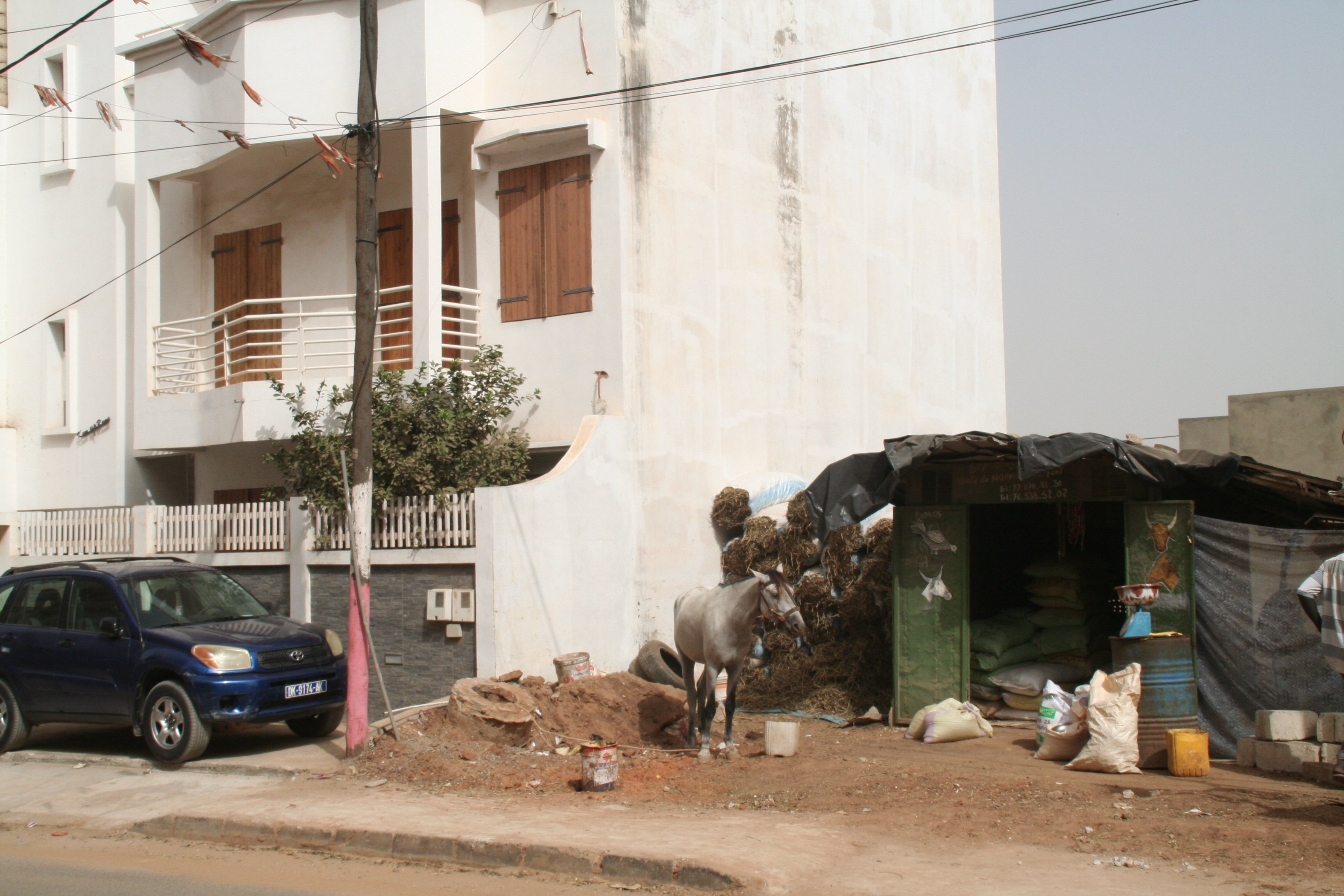 Von oben sehe ich Hütten aus Wellblech und eine aus Pappkarton, viele halb fertige und einige fertige mehrstöckige Häuser sowie dazwischen einen Esel und ein Pferd, die am Straßenrand angepflockt sind. Ein ganz normales Viertel in Dakar, vermute ich.